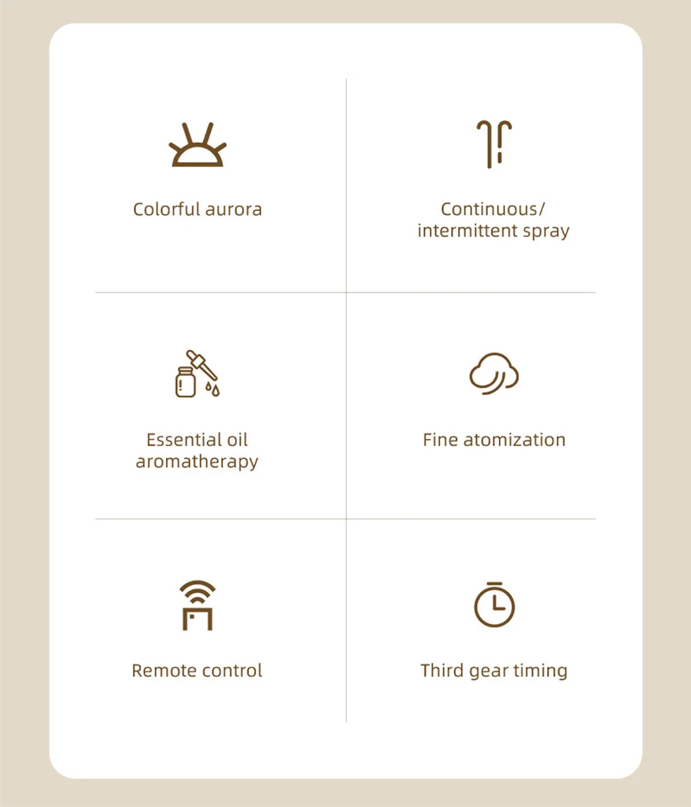 4. TIMER & ADJUSTABLE MIST OUTPUTS: The oil diffuser large room is pre-set 3 timer(2H,4H and 8H) for setting diffuser runing time. There are ontinuous spraying and Intermittent spraying two modes, you can adjust the mist output to the desired comfortable humidity level. easy to use,more at ease.