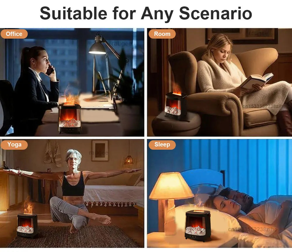 1. FLAME HUMIDIFIER:The flame aroma diffuser integrate with a built-in smart LED light that collects light and mist to create a realistic flame effect, adding a relax,soothe,calm atmosphere to your home,office,shop or more.